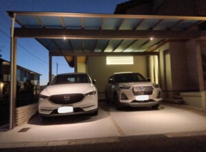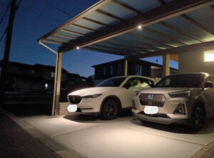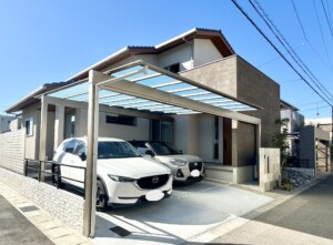 カーポートは、三協スカイリードを使用しており、梁延長タイプにした事により