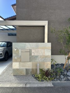 門柱は、全面タイル貼仕様になっており、B-Life.S のセレノプレートという商品を使用しております。